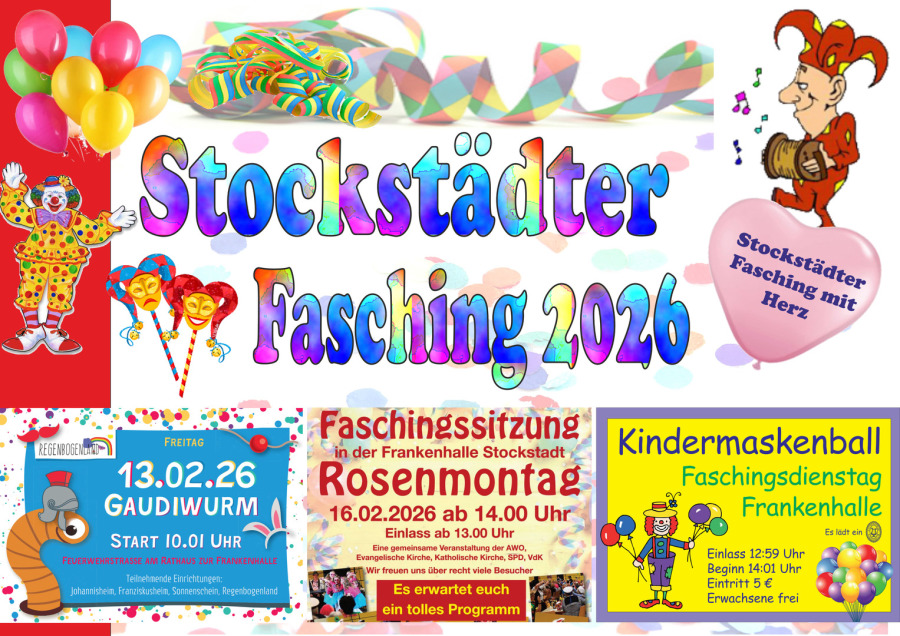 Das bunte Treiben startet wie gewohnt mit dem beliebten Gaudiwurm am Freitag vor Fasching – besonders der farbenfrohe Umzug der vier Stockstädter Kindergärten zaubert nicht nur den Kindern, sondern auch allen Zuschauern ein Lächeln ins Gesicht und läutet die ausgelassene närrische Zeit ein.